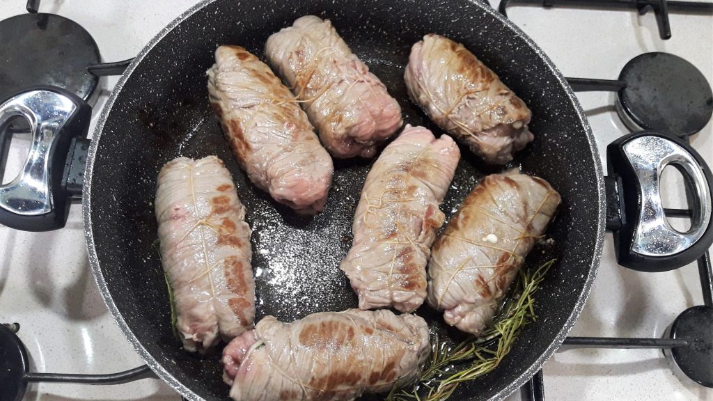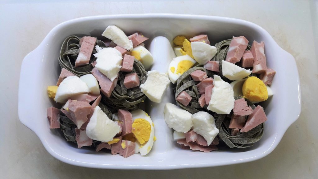 Falsomagro in saus en groene tagliatellenestjes uit de oven gevuld als de Falsomagro.