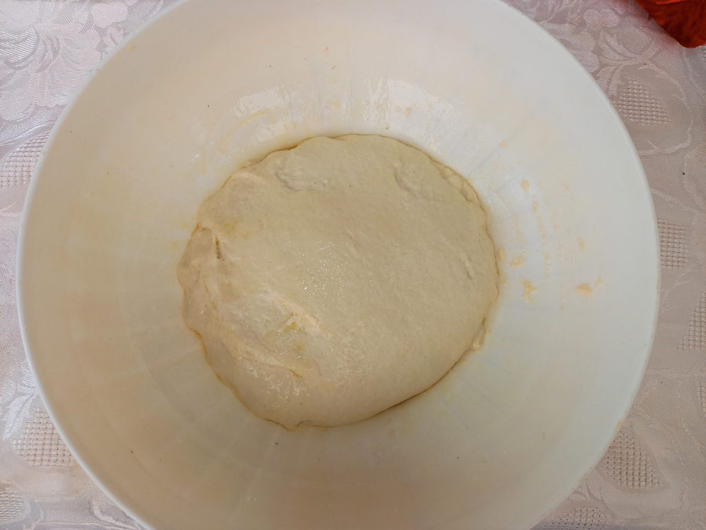 • Breng het deeg over op een met bloem bestoven werkblad, geef het deeg een regelmatige vorm naar wens (ik maakte het rond), en bestrooi met wat bloem type 0.