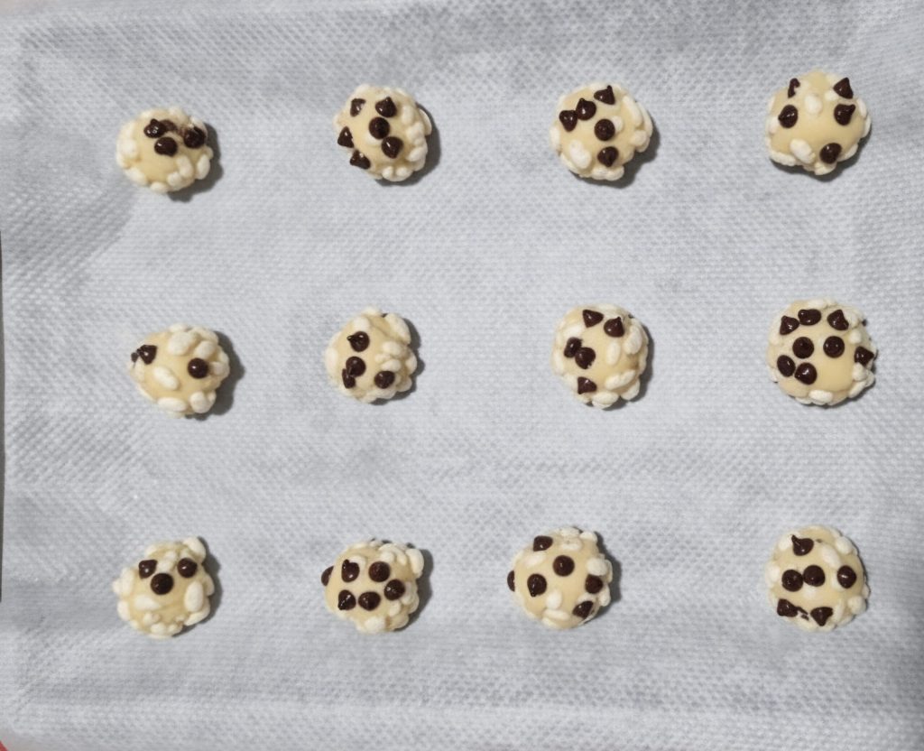 Doe de granen en het gedroogde fruit in een mixer en hak ze grof, doe ze in een kom samen met de bloem en de zoetstof. Voeg de olie, de honing of erythritol, eieren en chocoladedruppels toe en begin te kneden tot een stevig deeg.