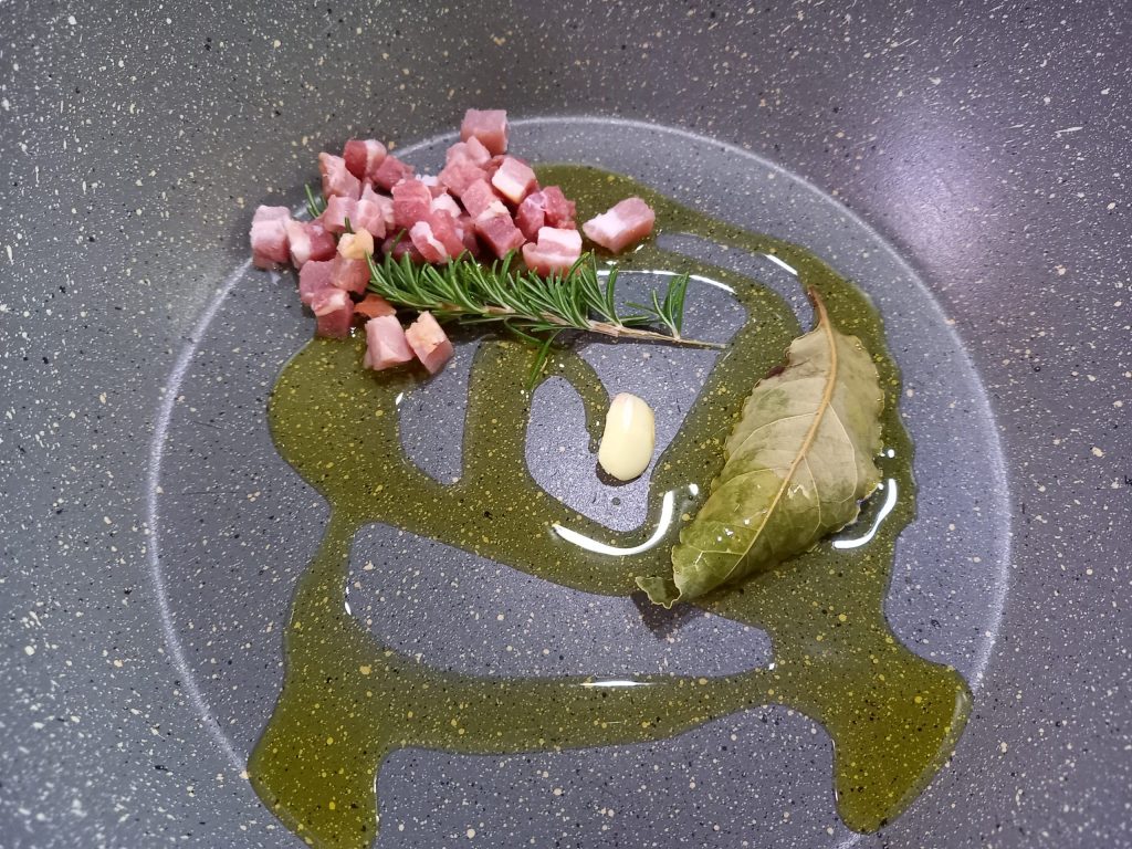 In een antikleefpan, giet nu de olijfolie, het resterende spek, het hele teentje knoflook, laurier en een takje rozemarijn.