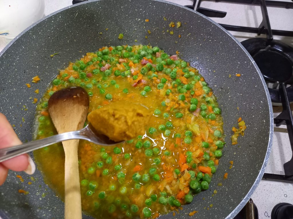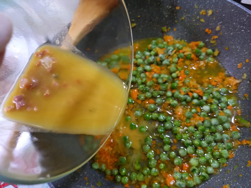 voeg de doperwten en het kookvocht van de zadels toe,