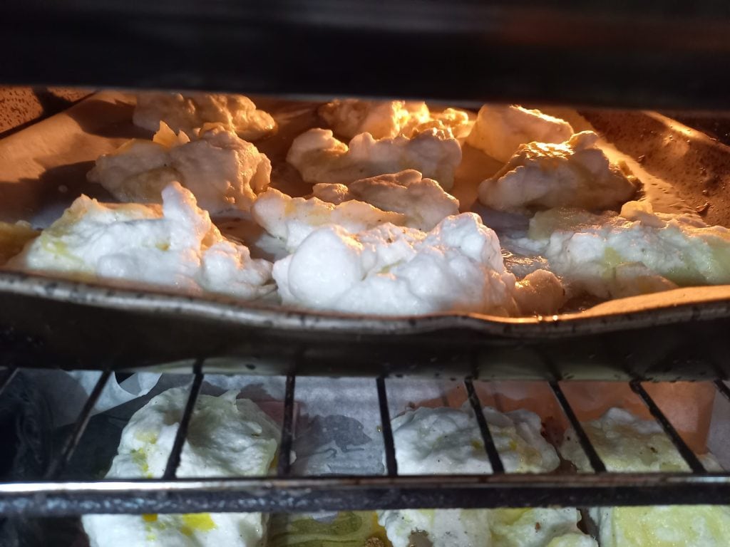 Een wolk van eiwitten en dunne aardappelschijfjes zal de visstukjes bedekken, waardoor ze beschermd worden tegen de hitte van de oven, zodat ze hun sappen niet verliezen en precies vochtig genoeg blijven om hun smaak te behouden.
