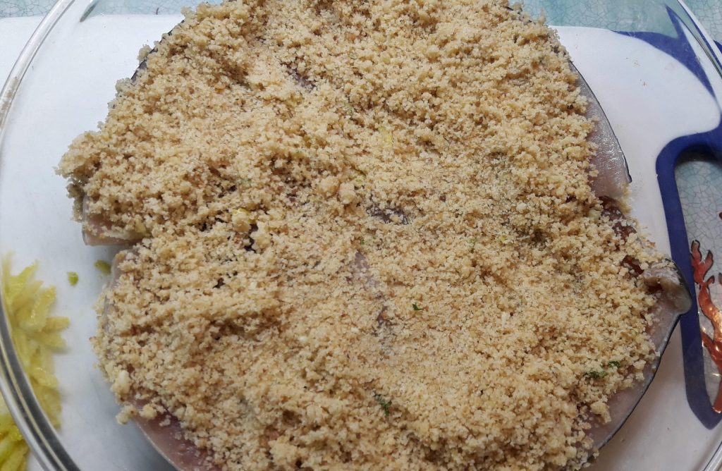 Bedek de filets met het eerder bereide paneermeel en druk het een beetje aan zodat het goed hecht aan de vis.