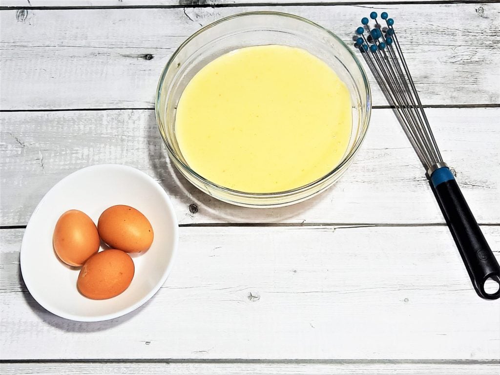 Laat het deeg vervolgens volledig afkoelen en voeg, zodra het koud is, de hele eieren één voor één toe (voeg de volgende pas toe als de vorige volledig is opgenomen). Het deeg dat je moet krijgen, moet niet te zacht zijn en mag niet gemakkelijk van de lepel vallen.
