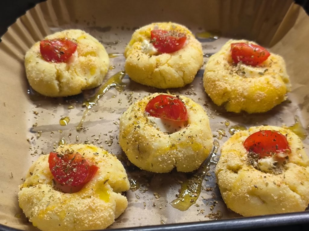 Het is een beslag gemaakt van alleen aardappelen, dan naar smaak gekruid en ze zijn niet gefrituurd, hoewel ze gefrituurd lijken, omdat ze zijn gekookt in een heteluchtfriteuse. Als vulling koos ik mozzarella, die ze smeuïg maakt, en tomaat, maar je kunt kiezen voor de vulling die je het lekkerst vindt. Je hoeft alleen maar de aardappelen te kneden met de bloem en ze naar smaak te kruiden, ze vervolgens te vullen en te koken en in een paar minuten proef je de lekkernijen die iedereen, jong en oud, gek maken.