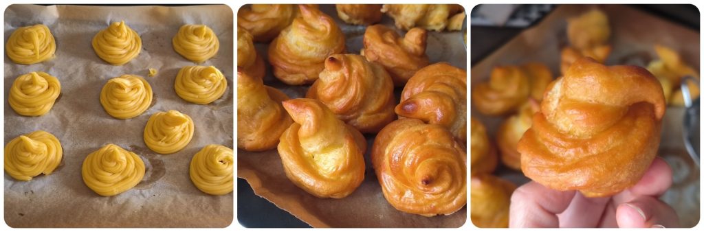 Zodra je alle eieren hebt toegevoegd, zal het deeg erg romig maar stevig zijn. Doe het in een spuitzak en begin hoopjes te maken op een bakplaat bekleed met bakpapier, met het grote stervormige spuitmondje. Begin vanaf de basis en sluit de cirkel. Voeg niet te veel deeg toe anders zullen de bigne’ aan elkaar vast blijven plakken. Bepaal zelf de grootte, ik heb middelgrote bigne’ gemaakt. Bak het in de hete oven op 200 graden 10 minuten en je zult zien dat er een korstje ontstaat. Haal ze op dat moment uit de oven en dompel ze in de olie die je hebt verwarmd. Vergeet niet dat de temperatuur van de olie tussen de 160/170 graden moet zijn. Laat ze uitlekken op absorberend papier en vul ze met de room en bestrooi ze tot slot met poedersuiker
