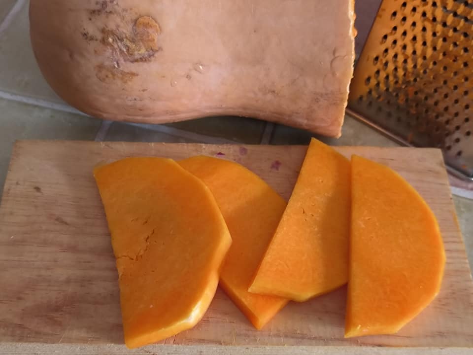 • Snijd vier plakjes van de pompoen, ik heb een butternut gebruikt omdat de plakjes beter rond worden, maar elke soort pompoen is prima. Halveer de plakjes pompoen en begin de schnitzel te maken.