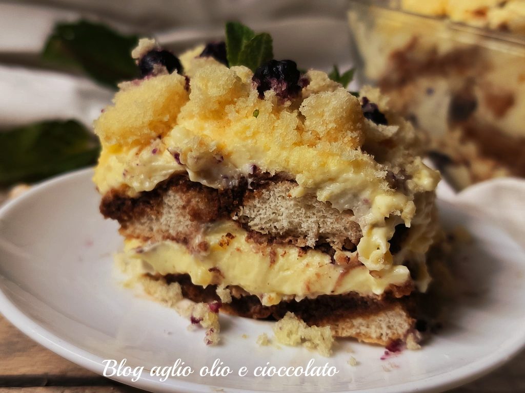 • Bereid een ovenschaal, ik heb een vierkante container gebruikt, doop de lange vingers in de koffie en bedek de hele bodem van de schaal, voeg een goede hoeveelheid room toe en bestrooi met cacao, maak een andere laag en bedek uiteindelijk met de blokjes cake en decoreer met bosbessen en muntblaadjes.