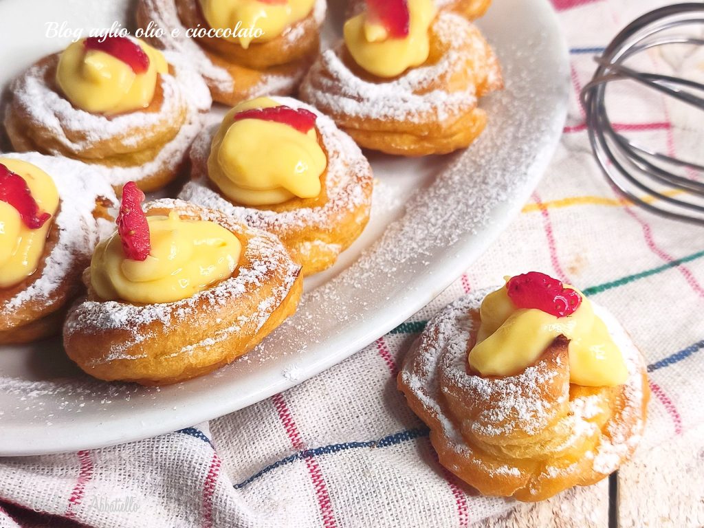 Zoals alle traditionele recepten zijn er verschillende varianten, vooral in de vulling zoals de bigne’ mimosa, of met witte chocoladeroom, maar volgens traditie worden de zeppole altijd gevuld met banketbakkersroom en versierd met een ingelegde kers, maar in dit geval heb ik aardbeien gebruikt.