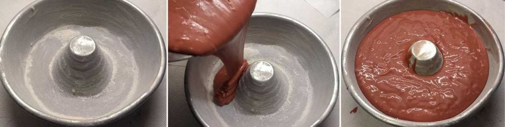 Klop met een elektrische mixer of een keukenmachine de eieren met de suiker tot ze mooi opgezwollen en schuimig zijn, voeg de olie beetje bij beetje toe terwijl de mixer in beweging is, dan de nepboterroom en ten slotte de gezeefde bloem met de bakpoeder, baksoda en cacao. Voeg tot slot de rode kleurstof toe. Vet en bloem een tulbandvorm en giet het beslag erin. Bak in de oven op 180 graden gedurende ongeveer 35 minuten. Pas aan met je eigen oven. Haal uit de oven en laat afkoelen.