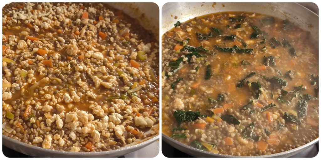Voeg de geraspte pasta toe en dan in de kook: Voeg de geraspte pasta toe, deze moet direct met de linzen koken, voeg altijd water toe, oma zei “Ze mogen niet uitdrogen”, breng op smaak met zout en voeg vervolgens de bladeren van de cavolo nero toe. Zodra de pasta gaar is, verdeel deze over de borden en geniet van dit wonder.