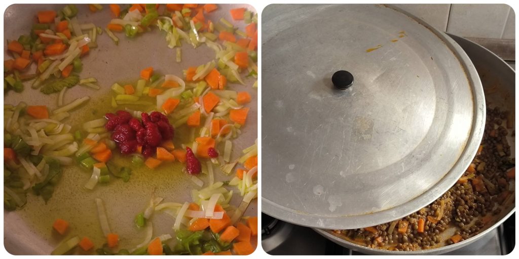 Bereid de basis van de soep voor: Maak een soffritto in de ketel met knoflook, selderij, wortel, prei en een scheutje olie en voeg dan de tomaat toe, meng alles, voeg de linzen toe en voeg dan 3 eetlepels heet water toe, breng op smaak met zout, dek af met een deksel en laat ongeveer 10 minuten intrekken. Snijd de aardappel in stukjes en voeg deze toe aan de ketel, als het water veel is ingedampt, voeg dan nog een lepel toe.