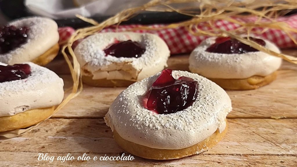 Recept meringuekoekjes met onfeilbaar zanddeeg, een speciaal koekje dat tweemaal gebakken wordt, maar wat dit koekje speciaal maakt is juist het onfeilbare zanddeeg dat tweemaal gebakken wordt zonder zijn brosheid en zachtheid te verliezen. In het begin dacht ik dat dit recept niet zou lukken vanwege de dubbele baktijd van het zanddeeg, ik dacht dat het erg hard zou worden, maar er kwamen fantastische meringuekoekjes uit. Voor dit heerlijke recept moet ik Fior di frolla bedanken. Ik raad je aan om een kijkje te nemen op haar blog, ze maakt geweldige dingen. Terug naar het recept, ik heb de koekjes gevuld met een bosvruchtenjam, maar ik heb ook een versie met chocolade gemaakt die ik binnenkort zal publiceren. Laten we nu kijken wat we nodig hebben en hoe we het recept voor meringuekoekjes met onfeilbaar zanddeeg bereiden.