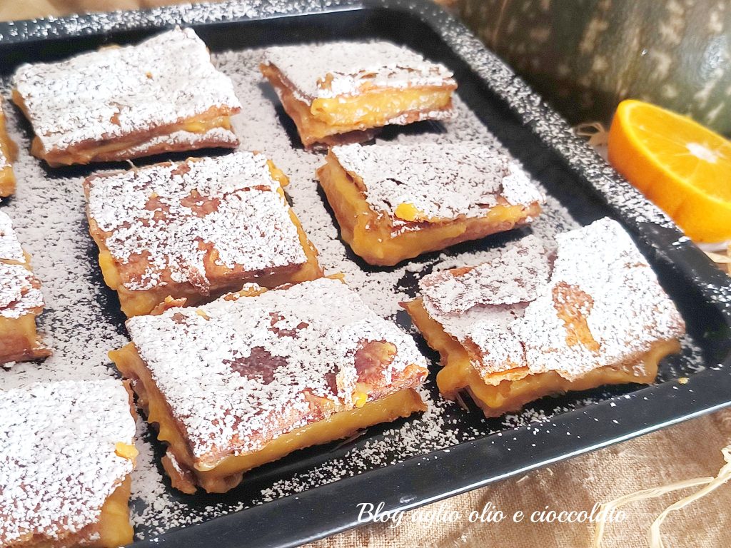 Goudbruine en knapperige bladerdeeggebakjes, gevuld met een zachte crème van pompoen en sinaasappel. Makkelijk, snel en perfect voor een smakelijke snack.