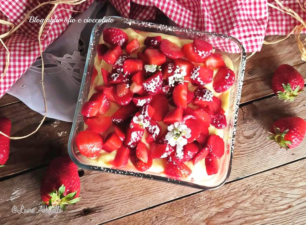 Snijd de aardbeien in stukjes, doe ze in een kom met de poedersuiker en het citroensap en meng, bewaar er een beetje voor de decoratie. Voeg het water toe en mix alles met een staafmixer, giet ze in een koekenpan en laat ze ongeveer 7/8 minuten koken totdat ze bubbelen, haal ze dan van het vuur en laat afkoelen. Giet de melk in een kom en begin de lange vingers te weken, leg ze in een ovenschaal, bedek ze met de aardbeiencompote en daarna met de crème, maak een tweede laag en decoreer met de aardbeien die je apart hebt gezet. Bewaar het dessert in de koelkast als je het niet meteen eet.