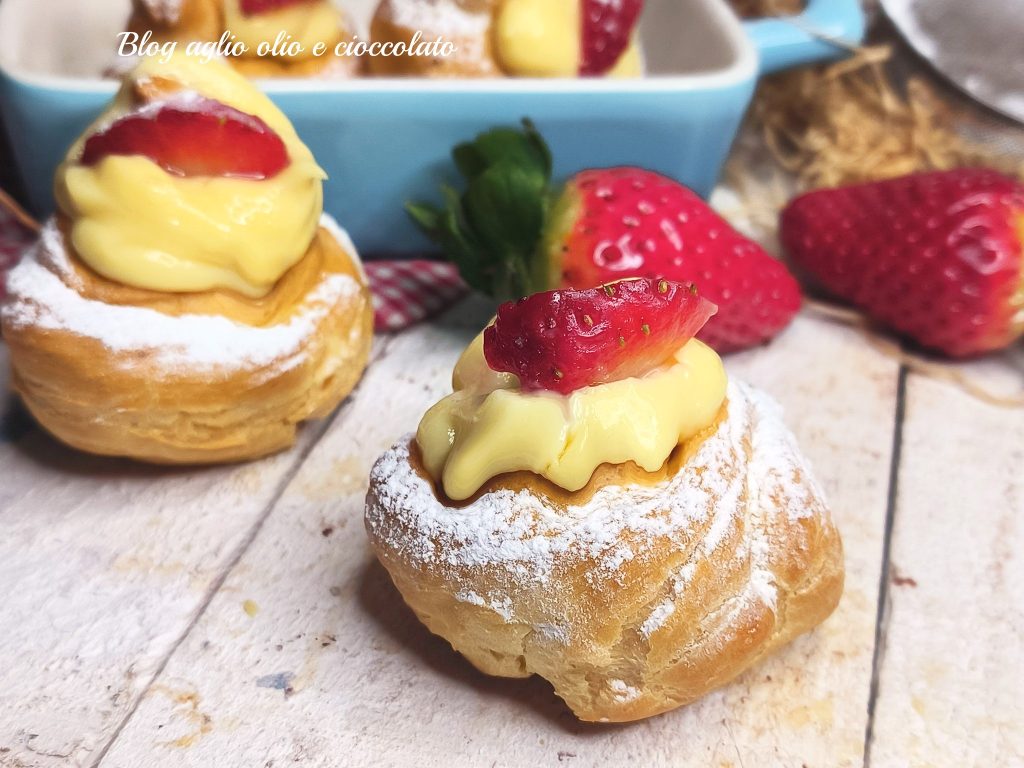 Plaats de zeppole in het mandje van de heteluchtfriteuse en kook ze volgens het ovenprogramma. Bij mij 13 minuten op 180 graden met het dessertprogramma en daarna verhogen tot 200 graden voor nog 7/8 minuten. De laatste minuten, verwijder het vel papier. Eenmaal afgekoeld, vul ze met de spuitzak, decoreer ze met de aardbeien en bestrooi ze met poedersuiker.