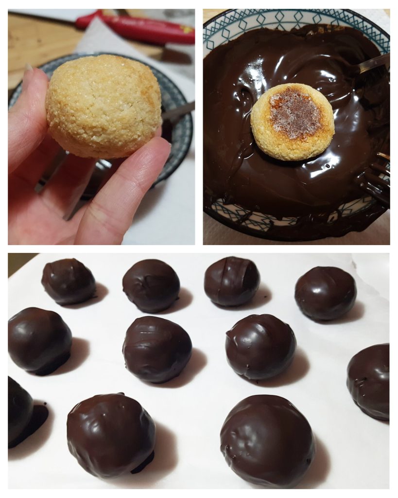 • Allereerst, voor het maken van deze amandel bon bons, moet je de amandelen fijn malen. Verwarm de oven voor op 170°. Meng in een kom het verkregen amandelmeel, kristalsuiker, alle aroma’s zowel droog als vloeibaar, de eiwitten en kneed een paar minuten met een spatel of met je handen tot je een homogeen en plakkerig deeg hebt. Maak dan kleine bolletjes van 20-30 g elk en plaats in het midden van elk bolletje een ingelegde kers. Sluit goed af en leg ze op een met bakpapier beklede bakplaat. Bak 10-12 minuten op 170°. Niet langer bakken, anders worden ze hard. Zet de oven uit en laat volledig afkoelen.