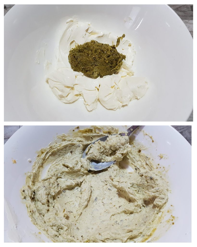 • Eerst moet je de zoute pestomousse bereiden voordat je de bladerdeegvlechtjes met pesto maakt. Meng in een kom de mascarpone of Philadelphia met de pesto tot een groene mousse.