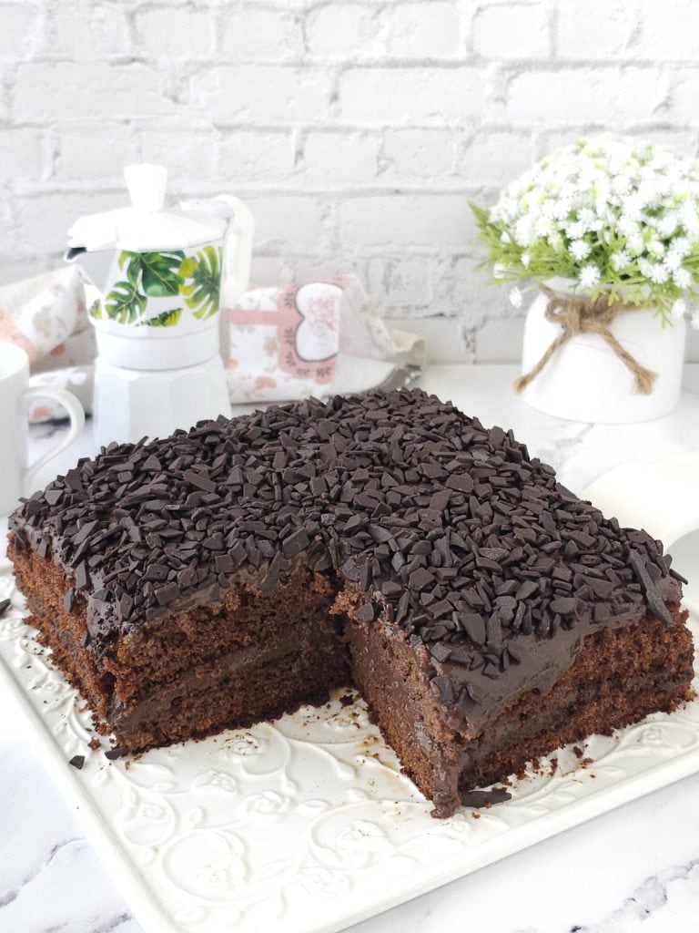 • Snijd de taart doormidden en besprenkel met melk of suikerwaterstroop. Giet de helft van de chocoladeroom erover en strijk glad. Leg de andere cakelaag erover, eveneens licht bewerkt met melk of suikerwater, en giet de resterende room erover uit. Strijk gelijkmatig uit. Zet de taart in de koelkast om op te stijven voor 5-6 uur of de hele nacht.
