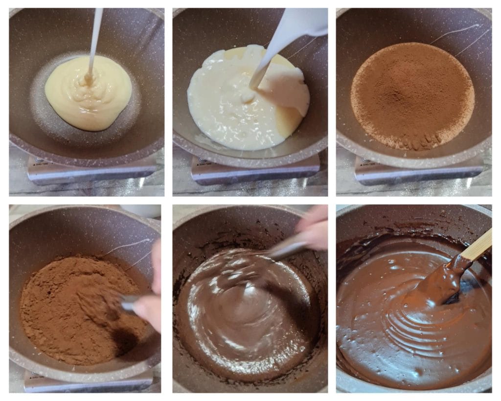 • Giet in een sauspan de gecondenseerde melk, melk en ongezoet cacaopoeder, en roer grondig. Breng aan de kook en blijf roeren met de garde. Voeg als laatste de stukjes pure chocolade toe en laat ze volledig smelten terwijl je goed blijft roeren. Zet het vuur uit en laat afkoelen met plasticfolie erop.