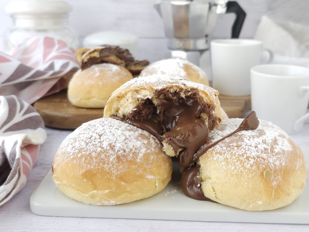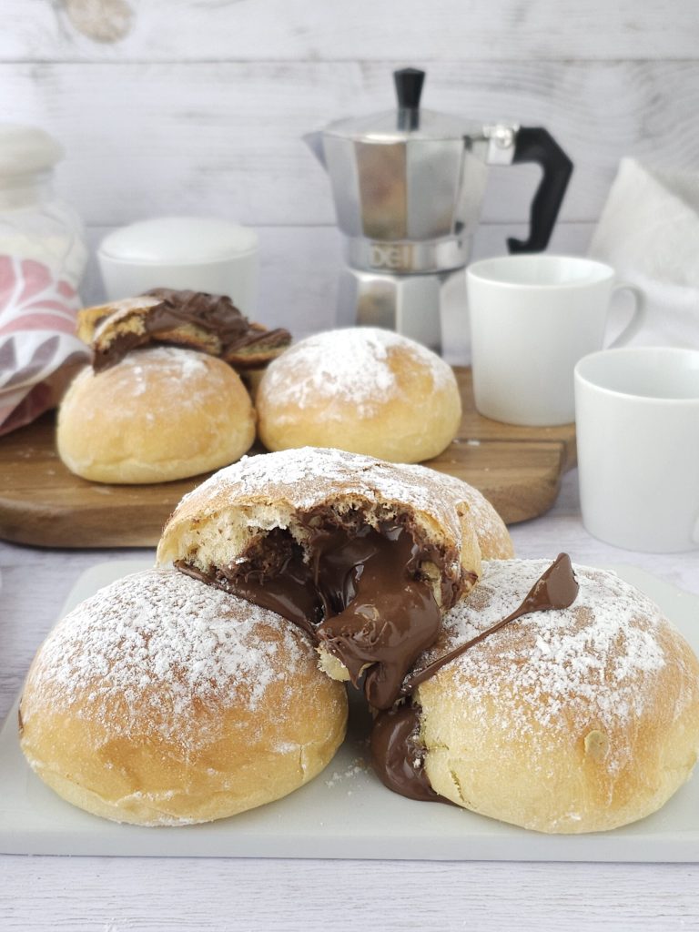 • Wanneer het deeg in volume is verdrievoudigd, leg het op een met bloem bestoven werkblad en neem voorzichtig stukjes deeg en vorm balletjes van ongeveer 40 g elk. Leg ze op een bakplaat bekleed met bakpapier en laat nog 1-2 uur rijzen. Wanneer ze in volume zijn verdubbeld, bak ze dan in een voorverwarmde oven op 180°C gedurende 10-13 minuten of tot ze licht goudbruin zijn. Bak ze niet te lang. Haal ze uit de oven en laat een paar minuten afkoelen, snijd ze dan met de handvat van een houten lepel of aan de onderkant of aan de zijkant een gat en vul ze met Nutella met een spuitzak.