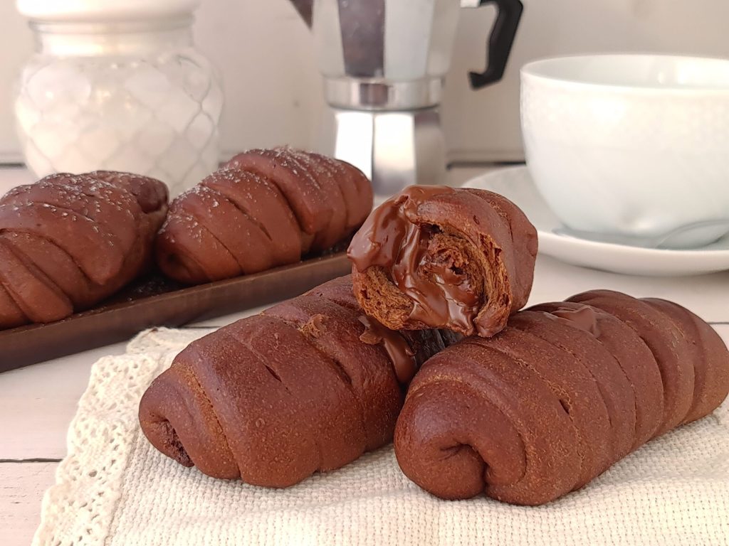 Neem het gerezen deeg en keer het om op een met bloem bestoven werkblad en vorm een rechthoek door eerst voorzichtig met de handen te drukken en dan met de deegroller, de dikte moet ongeveer 5 mm zijn. Maak kleine rechthoeken met behulp van een mes of pizzasnijder, vul met nutella aan de korte kant en aan de tegenovergestelde kant maak je sneden om stroken te vormen. Rol op vanaf de tegenovergestelde kant, dus vanaf de vulling naar de gesneden stroken toe en leg de fluiten op een met bakpapier beklede bakplaat, goed uit elkaar, dek af met voedselfolie en laat 2 uur rijzen of tot verdubbeling.
