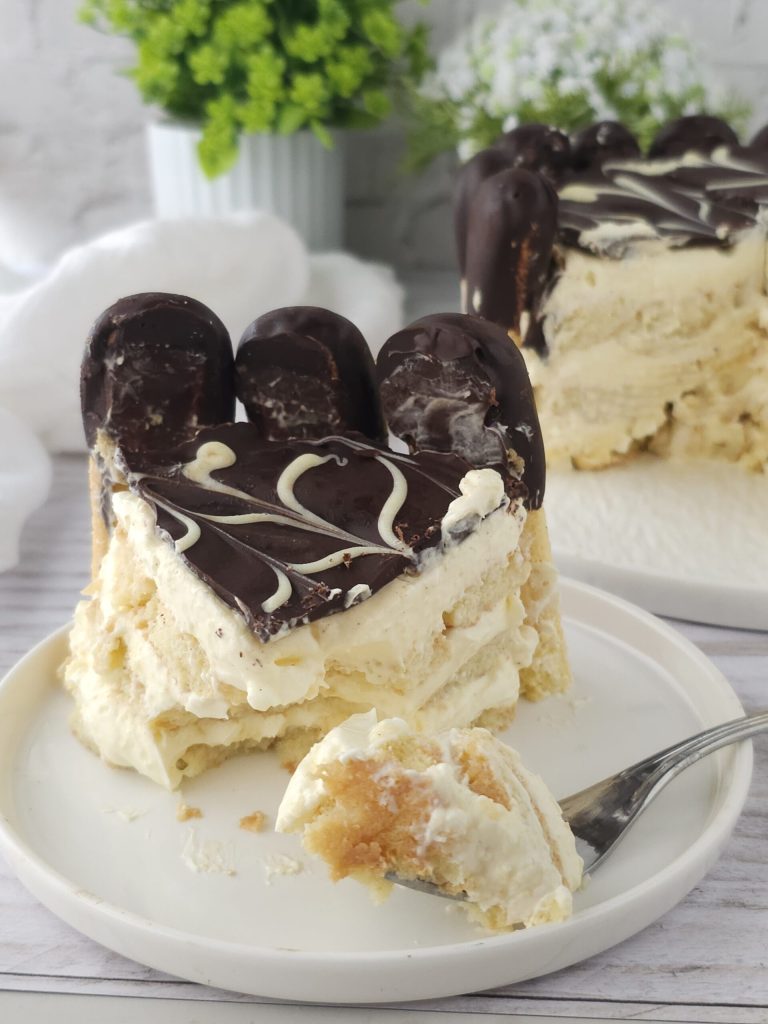 • Als eerste moet je ongeveer 1 cm van de puntjes van de langevingers afsnijden en de overige uiteinden met eerder gesmolten chocolade glaceren. Laat ze drogen op een met bakpapier bekleed bord in de koelkast gedurende 30 minuten. Als ze koud zijn, neem een serveerschaal en plaats een metalen ring of een uitneembare ronde springvorm van 20 cm en rangschik de langevingers rondom, probeer ze goed in elkaar te laten grijpen zodat ze niet omvallen. Ik heb ervoor gekozen om elke basis van de langevinger op het bord vast te zetten met een beetje diplomaatroom. Leg vervolgens op de bodem gewone langevingers die alleen licht in een beetje melk of in een alcoholische siroop zijn gedoopt. Schenk een laag diplomaatroom op de bodem van de langevingers, maak een tweede laag van in melk gedoopte langevingers, giet er meer diplomaatroom op, nog een laag langevingers en tenslotte weer diplomaatroom. Zet de vorm in de koelkast om ongeveer 6–8 uur te rusten.