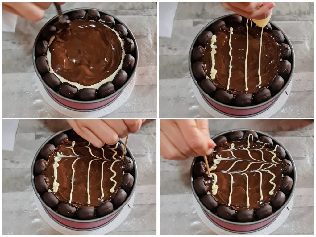 • Na de rusttijd smelt je de pure chocolade au bain-marie met een beetje melk of room tot een glanzende glazuur. Smelt in een andere kom de witte chocolade. Haal de taart uit de koelkast, giet de pure chocoladeglazuur erover en strijk glad; decoreer vervolgens met strepen gesmolten witte chocolade en maak met een tandenstoker motieven zoals op de foto. Verwijder de ring voorzichtig en zet de taart weer in de koelkast tot het moment van serveren.
