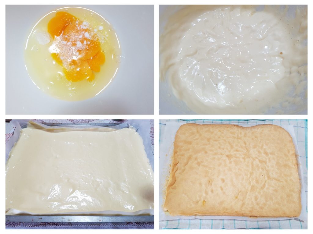 • Klop in een grote kom de eieren met de kristalsuiker en de vanille-essence 10-15 minuten tot ze schuimig en licht van kleur zijn, voeg dan de zonnebloemolie in een dunne straal toe en blijf kloppen. Voeg tot slot de gezeefde bloem 00, het bakpoeder en het zout toe en meng met een spatel van onder naar boven zonder het mengsel te laten inzakken, tot het mengsel glad en homogeen is. Bekleed een rechthoekige bakplaat van 30×40 met natgemaakt en uitgeknepen bakpapier en giet het mengsel erin, strijk het gelijkmatig glad met een platte spatel. Bak in een voorverwarmde statische oven op 180°C ongeveer 15 minuten. Als de basis klaar is (doe de tandenstokertest), leg deze dan op een snijplank of dienblad en verwijder voorzichtig het bakpapier en laat afkoelen.