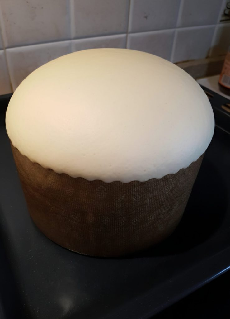 Wanneer het deeg gerezen is, het op het werkblad storten en een verstevigende vouw geven. Draai het om het glad te maken. Dat wil zeggen, het ronddraaien tussen de handen of op het werkblad om er een regelmatige bolvorm van te maken. Plaats het bolletje in de papieren vorm van 750 g voor panettone en laat rijzen tot verdubbeld of tot het deeg de vorm heeft bereikt. Bak vervolgens in een voorverwarmde statische oven op de onderste plank op 180º voor ongeveer 45 minuten of tot goudbruin. Zet uit en laat volledig afkoelen.