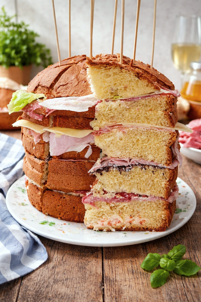 Snijd de panettone horizontaal in plakken. Plaats de basis op een serveerschaal en verdeel de capricciosa salade. Plaats de volgende laag panettone en dan de derde, zonder vulling ertussen om het portioneren te vergemakkelijken. Maak de tweede laag met mayonaise, salami en zongedroogde tomaten. Ga dan verder zoals voor de tweede vrije laag panettone en maak ook de derde vullaag met zwarte olijventapenade en gekookte ham. Ga verder met de vulling van mortadella en emmentaler in plakken en dan als laatste gekookte ham, smeerkaas, sla en salami. Vergeet niet om tussen elke laag een vrije laag zonder vulling te laten. Zet het dan in de koelkast om te rusten tot het moment van serveren.