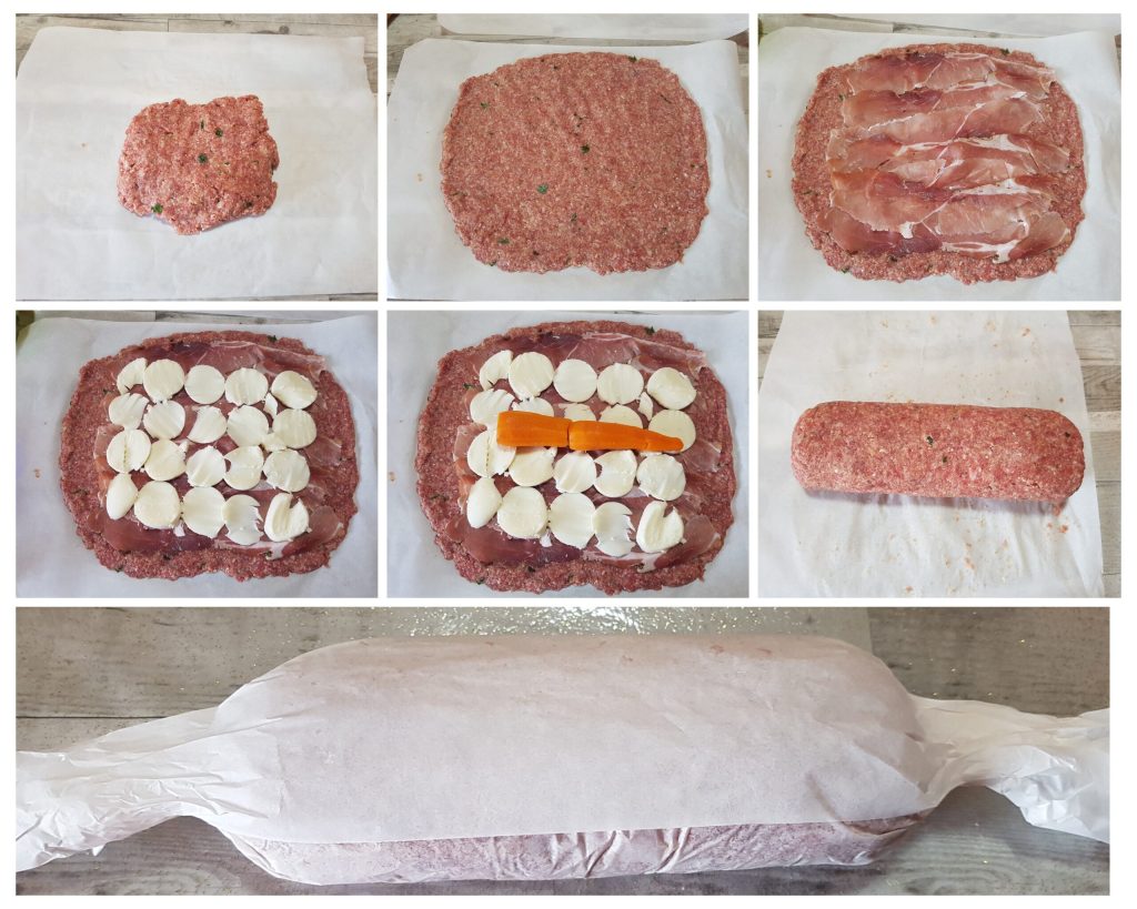 Op een vel bakpapier druk je het verkregen mengsel plat met een deegroller, zodat je een rechthoekige vorm krijgt. Leg de plakjes speck erop, vervolgens de plakjes scamorza en plaats de gekookte wortelen in het midden in de lengte. Rol met behulp van het bakpapier het gehaktbrood voorzichtig op en probeer ook de zijkanten goed samen te drukken. Sluit het gehaktbrood en draai het als een snoepje. Bak het in een voorverwarmde oven op 180º gedurende 35 minuten, als je een airfryer gebruikt, voorverwarm dan op maximale kracht gedurende 5 minuten en bak vervolgens 30 minuten op 180º.