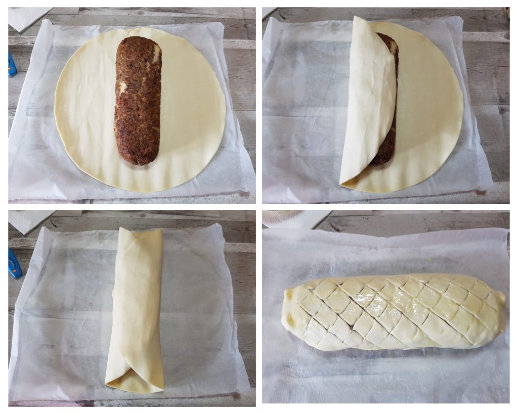 Als er 35 of 30 minuten zijn verstreken, rol het gehaktbrood uit het bakpapier en laat het 20 minuten afkoelen door het vlees met absorberend papier te deppen om alle sappen te absorberen. Rol ondertussen het bladerdeeg uit en leg het gehaktbrood in het midden, sluit het goed af en bestrijk de bovenkant met een eerder geklopt ei en snijd de bovenkant met een mes om een raster te maken. Bak het in een voorverwarmde oven op 160º gedurende nog eens 25 minuten of tot het goudbruin is, als je een airfryer gebruikt gedurende slechts 20 minuten op 160º en draai het halverwege de kooktijd om.