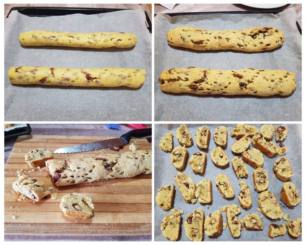 Leg het deeg op een licht met bloem bestoven werkblad en vorm 2 lange rollen van ongeveer 5 cm in diameter. Leg de rollen op een met bakpapier beklede bakplaat en bak ze 25-30 minuten in een voorverwarmde oven op 180°C. Haal ze uit de oven en laat ze 5-10 minuten afkoelen, snijd ze vervolgens in stukjes met een gekarteld mes. Leg alle stukjes terug op de bakplaat en laat ze nog 5 minuten roosteren in de oven.