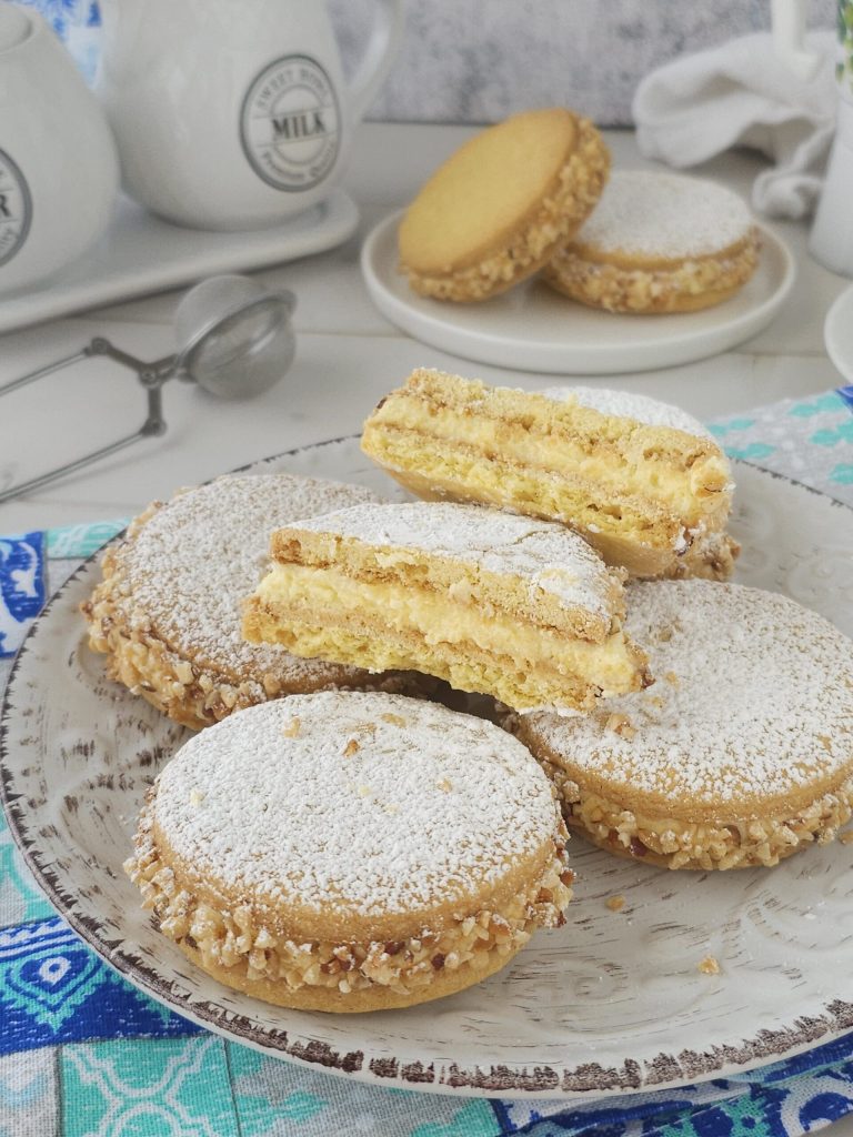 Hallo vrienden, vandaag stel ik jullie deze geweldige heerlijke Napolitaanse voor, typische Campaniaanse koekjes gevuld in dit geval met banketbakkersroom plus botercrème, echt heerlijk. Het is een dessert bestaande uit twee schijven van knapperig deeg, gevuld met een geurige mousselinecrème en de randen bedekt met een knapperige hazelnootkruimel. Commercieel zijn er veel varianten met heerlijke vullingen (chocoladeroom, pistacheroom, gearomatiseerde botercrème). Deze gebakjes mogen niet ontbreken op de zondagse pasteiplaat in Napels. Hieronder vindt u het recept..