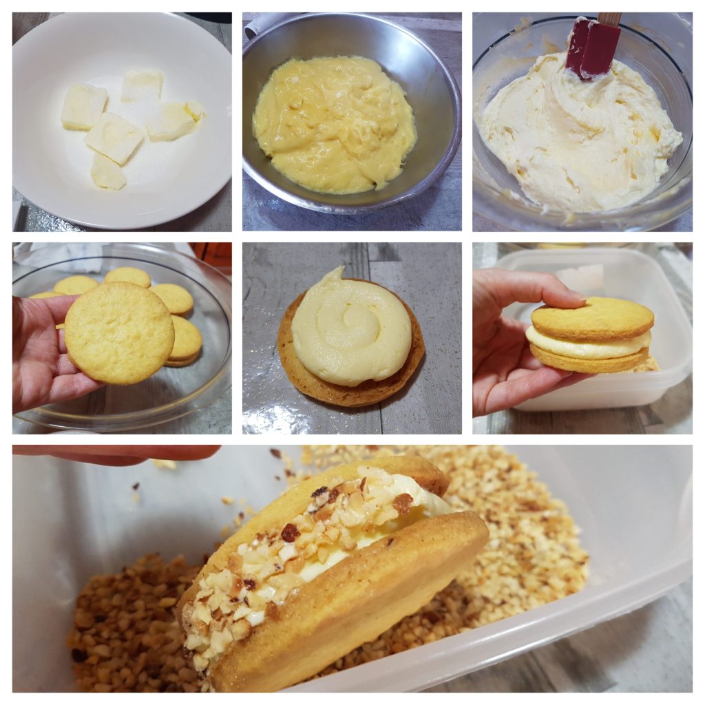 Klop in een kom met de elektrische gardes de zachte boter met de poedersuiker, voeg dan de afgekoelde banketbakkersroom lepel voor lepel toe tot een luchtige crème ontstaat. Doe de crème in een spuitzak met gladde spuitmond en vul de basis van een deegschijfje, sluit af met het andere schijfje en druk lichtjes aan om goed vast te hechten. Zodra de koekjes gevormd zijn, doop je de randen in de hazelnootkruimel zodat deze goed aan de crème hecht.