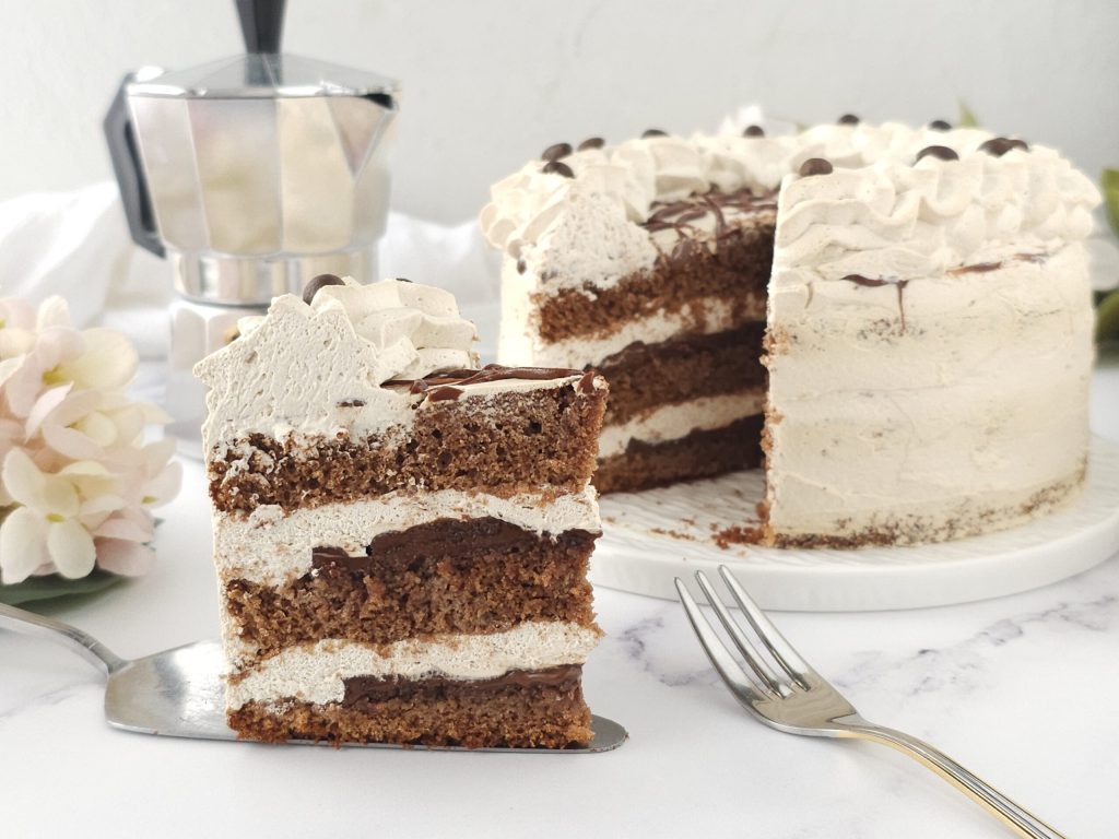 Snijd de biscuit in 3 schijven. Leg de eerste schijf op een serveerschaal en vul met een laag koffieslagroom. Doe in het midden de Nutella en sluit af met nog een laag koffievulling. Herhaal met de tweede biscuitschijf en sluit af met de laatste biscuitschijf. Strijk de hele taart af met de overige koffieslagroom en zet in de koelkast om op te stijven voor 3-4 uur. De overgebleven vulling moet in de koelkast bewaard worden, omdat deze nodig is voor de laatste stap, namelijk de decoratie.