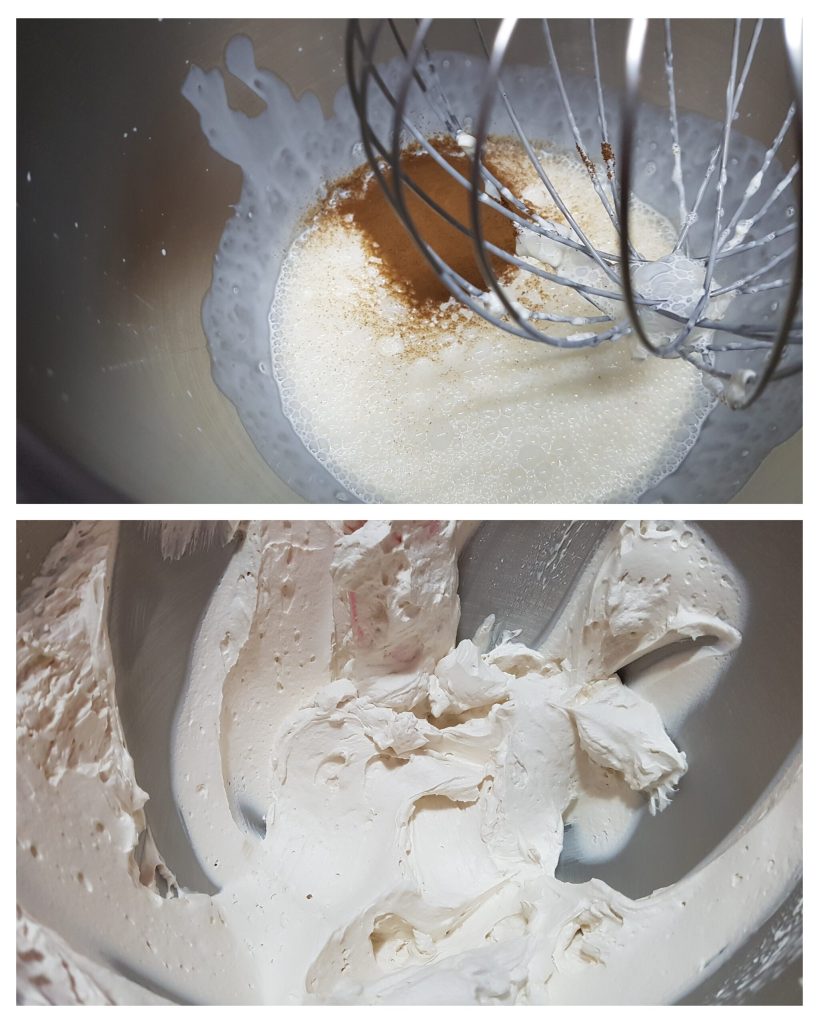 Klop in een kom met een elektrische klopper de koude mascarpone, de goed koude slagroom uit de koelkast en de instantkoffie tot een schuimig mengsel. In dit geval gebruikte ik gezoete slagroom, maar als je vloeibare verse slagroom wilt gebruiken, voeg dan 35g poedersuiker toe. Doe het mengsel in een spuitzak en zet het in de koelkast.