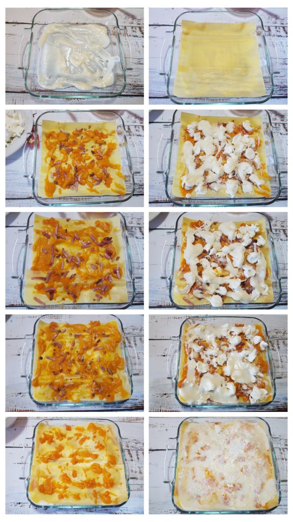 Wanneer de bechamelsaus lauw is, verdun deze met wat melk om het vloeibaarder te maken. Vet de bodem van een ovenschaal in, verdeel de bechamelsaus goed en leg de eerste laag lasagne, verdeel een beetje pompoenpuree, de pompoencrème, de in de pan gebakken speck, de in blokjes gesneden mozzarella, bechamel en ten slotte de geraspte kaas. Ga zo door met het afwisselen van lagen tot de ingrediënten op zijn, eindigend met de laatste laag lasagne met pompoencrème, puree en bechamel. Bestrooi de bovenkant met meer geraspte parmezaan en bak in een voorverwarmde oven ongeveer 30-45 minuten op 180-200°C. Om te weten of de lasagne gaar is, steek je er gewoon een vork in, als het erin zinkt, kun je de oven uitzetten. Als de bovenkant te donker wordt, kun je deze bedekken met aluminiumfolie.