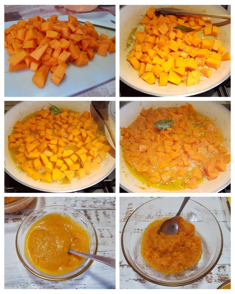 • Om deze heerlijke lasagne met pompoen en speck te maken, moet je de pompoen koken. Snijd de pompoen in blokjes en stoof deze in een brede pan met extra vergine olijfolie en gehakte ui. Voeg na een paar minuten zout, peper, salie, rozemarijn en bouillon toe en kook ongeveer 20 minuten. Wanneer de pompoen bijna gaar is en zacht, verwijder dan de salie en rozemarijn en voeg indien nodig nog wat zout toe. Zet het vuur uit en pureer de helft van de pompoen met een staafmixer. Zet de resterende pompoen apart.