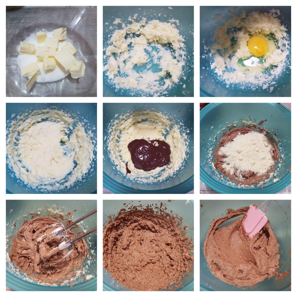 Smelt in een steelpan de pure chocolade au bain-marie en laat deze afkoelen. Doe de zachte boter samen met de poedersuiker in een kom en klop tot een mooie romige en luchtige massa is verkregen. Voeg het ei toe en blijf kloppen. Giet ten slotte de gesmolten pure chocolade erbij en blijf met de elektrische kloppers kloppen. Voeg tot slot het amandelmeel en de rum toe en meng grondig. Zo krijg je een homogeen en luchtig mengsel.