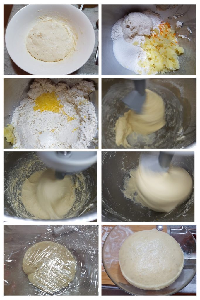 Als het voordeeg klaar is, giet het dan in de kom van de planetaire mixer en voeg de geplette gekookte aardappel toe (zorg ervoor dat deze niet warm is), de kristalsuiker, de eetlepel limoncello, de resterende bloem, de geraspte sinaasappel- en citroenschil en mix een paar minuten met de haakvormige klopper. Voeg vervolgens de rest van de melk en het ei toe en blijf kneden. Voeg ten slotte het zout toe en kneed ook op snelheid 3 of hoge snelheid. Voeg als laatste de zachte boter beetje bij beetje toe, zorg ervoor dat het goed wordt opgenomen en blijf kneden. Voor een glad en homogeen deeg heb je ongeveer 15-18 minuten nodig, of totdat het deeg goed is gekneed. Als je geen planetaire mixer of een andere keukenrobot hebt, kun je het deeg ook met de hand kneden in een kom en vervolgens op een werkblad. Laat het deeg rijzen in een kom bedekt met huishoudfolie in een uitgeschakelde oven met het lampje aan voor ongeveer 2 uur of tot het verdubbeld is.