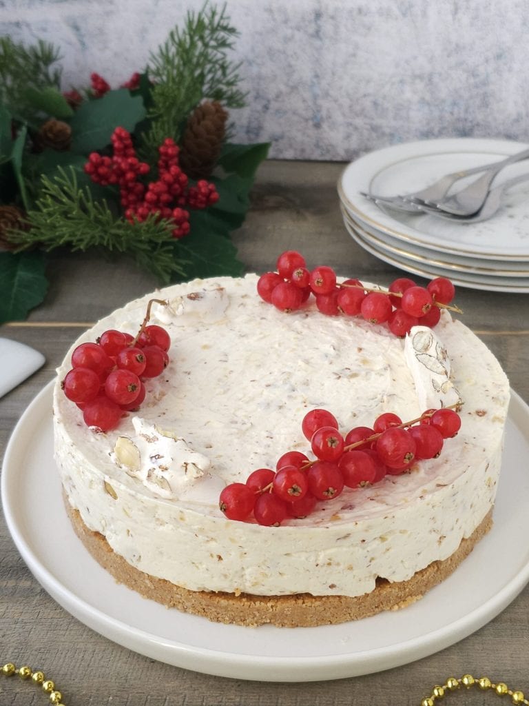 Haal de taart uit de vriezer en verwijder voorzichtig de springvormring met behulp van een föhn, verwijder ook het bakpapier en leg de taart op een serveerschaal. Zet de cheesecake ongeveer 1 uur in de koelkast om op temperatuur te komen en decoreer vervolgens de bovenkant met trosjes rode bessen en blokjes nougat. En daar is hij klaar om te serveren, de nougat cheesecake. Ik hoop dat jullie dit laatste recept leuk vinden, tot de volgende keer vrienden.