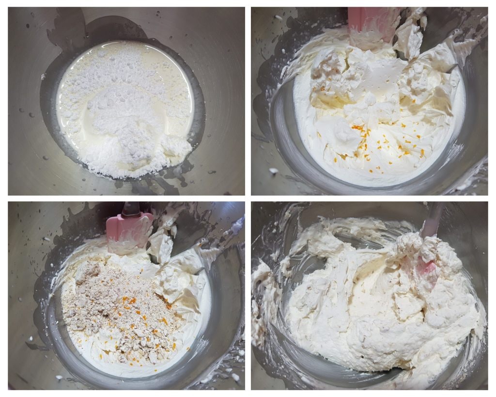 In een grote kom voeg je de goed gekoelde mascarpone uit de koelkast, de goed gekoelde verse vloeibare room samen met de poedersuiker en klop enkele minuten op met de elektrische kloppers tot een luchtig en dik mengsel. Voeg de rum, de gehakte nougat en een flinke rasp van sinaasappelschil toe en meng voorzichtig met een spatel.