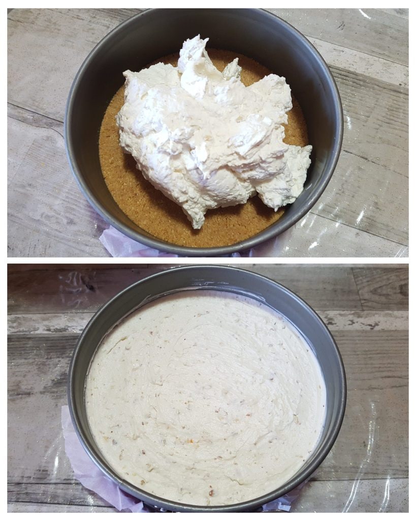 Haal de vorm uit de koelkast of vriezer en giet het mengsel erin. Strijk de bovenkant goed glad met een lepel of een gladde spatel voor gebak en zet de cheesecake ongeveer 3 uur in de vriezer om op te stijven.
