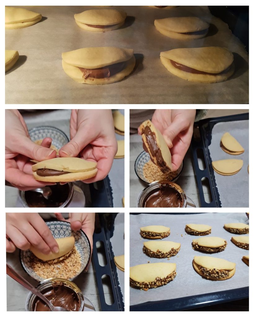 Leg alle koekjes op een bakplaat bekleed met bakpapier en bak in een voorverwarmde statische oven op 170ºC gedurende 15 minuten of tot ze goudbruin zijn. Haal uit de oven en laat een paar minuten afkoelen. Wanneer ze nog warm zijn, smeer je met een lepeltje de semi-open rand in met meer nutella en dompel je het koekje in de hazelnootgruis. En daar zijn ze dan, klaar.