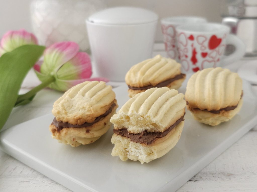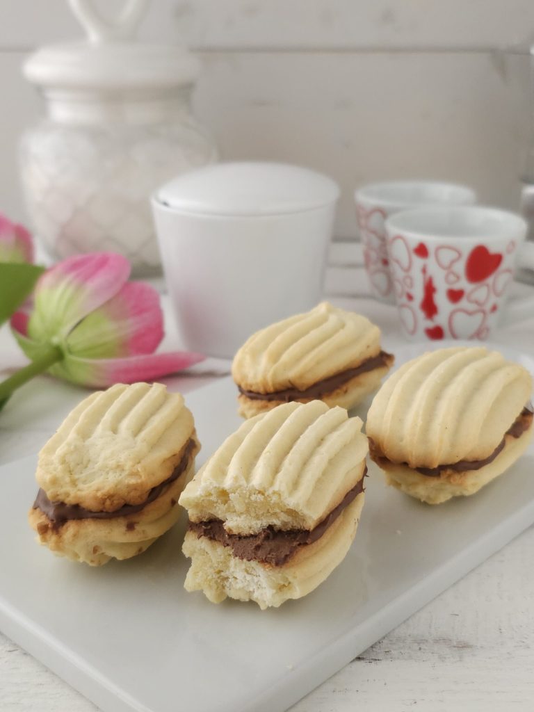 • Neem de koekjes en vul ze met Nutella, of pistache smeerpasta, of opgeklopte ganache of jam. Als je wilt, kun je ze ook in chocolade glazuren. Deze keer wilde ik ze eigenlijk naturel laten, op zijn hoogst bestrooid met poedersuiker voordat ik ze serveer. Ik hoop dat je mijn laatste recept leuk vindt, tot de volgende keer vrienden.