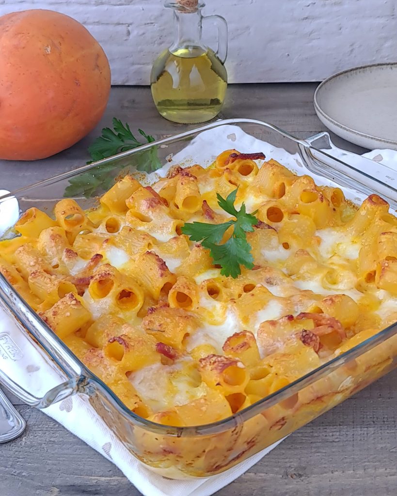 • Kook in een kasserol de pastasoort naar keuze (ik gebruikte mezzi rigatoni) in kokend gezouten water. Giet de pasta zeer al dente af en stop de kooktijd met behulp van een vergiet onder de koude kraan. Doe de pasta, de pompoencrème, het spek in een kom en meng goed. Doe de pasta in een ovenschaal en voeg de geraspte kaas toe, daarna de mozzarella in blokjes en meng. Voeg ten slotte nog een beetje geraspte kaas toe en bak op 180 graden voor ongeveer 20 minuten of tot ze goudbruin zijn. Zet het vuur uit, laat een paar minuten afkoelen en serveer dan.