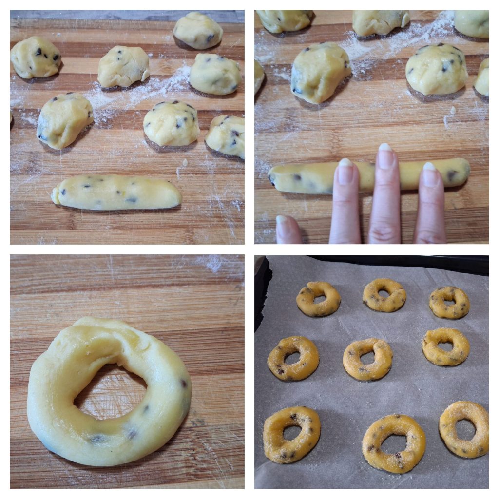 Neem porties van 30 g deeg en rol ze onder de handpalmen over het werkblad tot lange rolletjes die je aan elkaar sluit om ringetjes te vormen. Rol ze vervolgens door de kristalsuiker en leg ze op een met bakpapier beklede bakplaat (goed uit elkaar). Bak in een voorverwarmde statische oven op 170º gedurende 15 minuten of totdat ze goudbruin zijn. Zet de oven uit, haal de koekjes eruit en laat afkoelen.