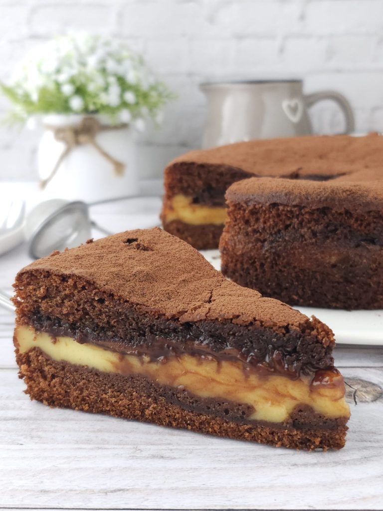 Eerst moet de banketbakkersroom van tevoren worden bereid en afgekoeld. Je kunt mijn recept of je eigen favoriete recept gebruiken. Mijn recept vind je via de onderstaande link https://blog.giallozafferano.it/rosly/ricetta-crema-pasticcera/ . Nu zijn we klaar om het chocoladedeeg te maken. Klop in een grote kom met een elektrische garde de eieren met de kristalsuiker en de vanille-essence een paar minuten op. Voeg de zonnebloemolie toe en meng nog een paar minuten. Voeg vervolgens ook de melk toe terwijl je blijft kloppen met de elektrische garde en voeg ten slotte de gezeefde bloem, het ongezoete cacaopoeder en een snufje fijn zout toe en mix opnieuw. Voeg als laatste het zakje bakpoeder toe en meng alles voorzichtig nog een paar minuten totdat je een glad en homogeen beslag krijgt.